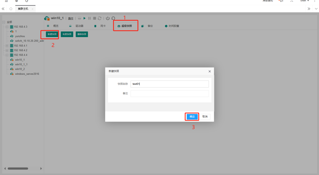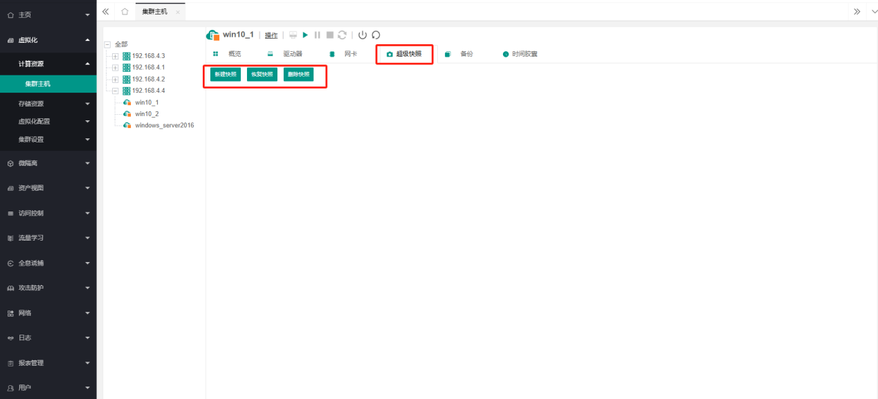 功能入口总结:所有快照操作均通过 虚拟化 -> 计算资源 -> 集群主机 -> 选择具体虚拟机 -> “超级快照”标签页 完成。
